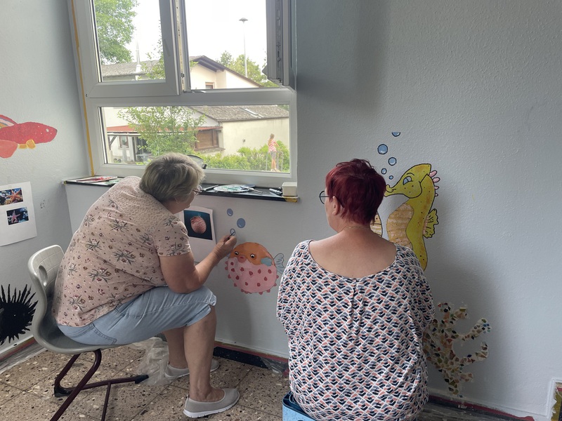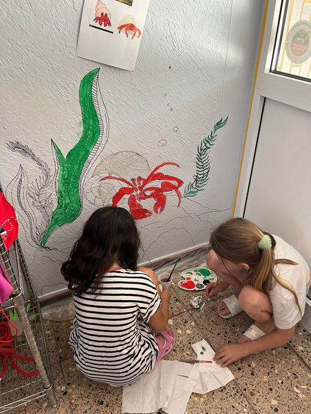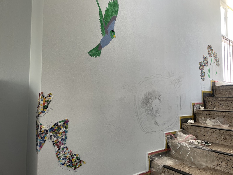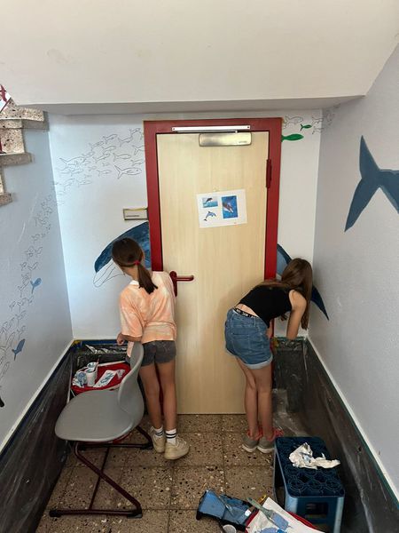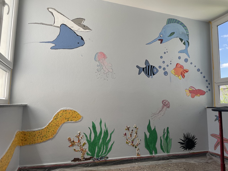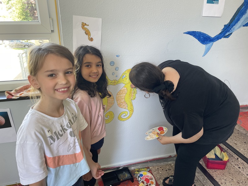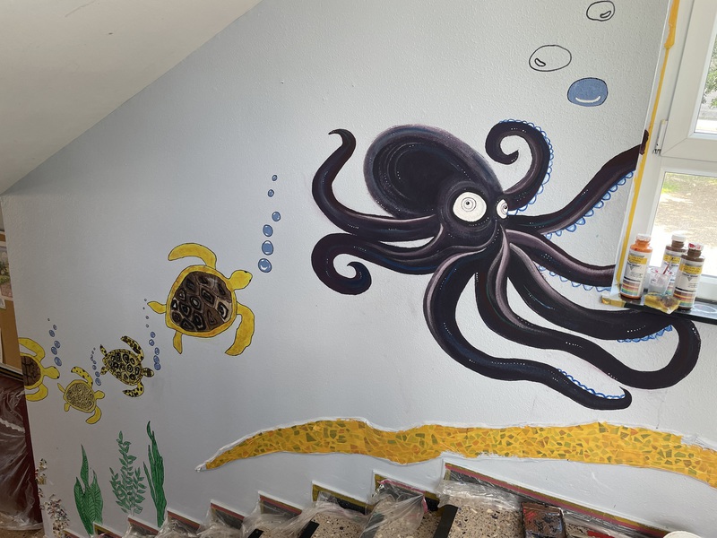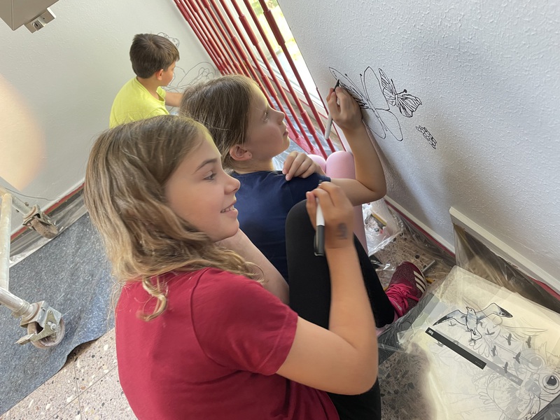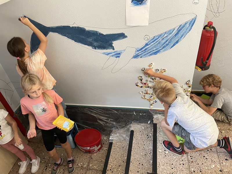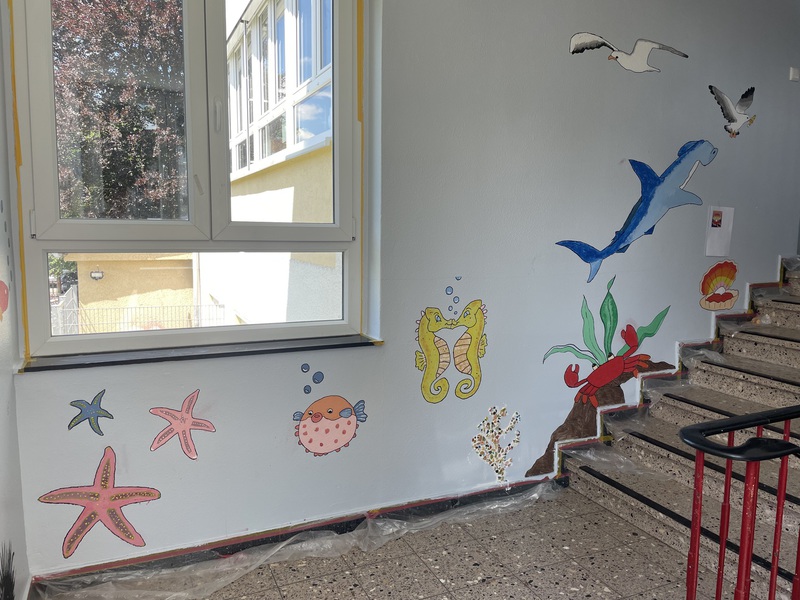 Eine Woche widmeten sich die Kinder einem fächerübergreifenden Projekt "Schule kreativ gestalten" und kamen mit Unterstützung der Lehrkräften zu sehenswerten Ergebnissen. Jede Schuletage repräsentiert nun eine andere Tierwelt. Während im Erdgeschoss Tiere gezeichnet wurden, die sich im Meer aufhalten, folgen Tiere am Land im ersten Stock. Im zweiten Stock finden sich viele fliegenden Tiere wieder.